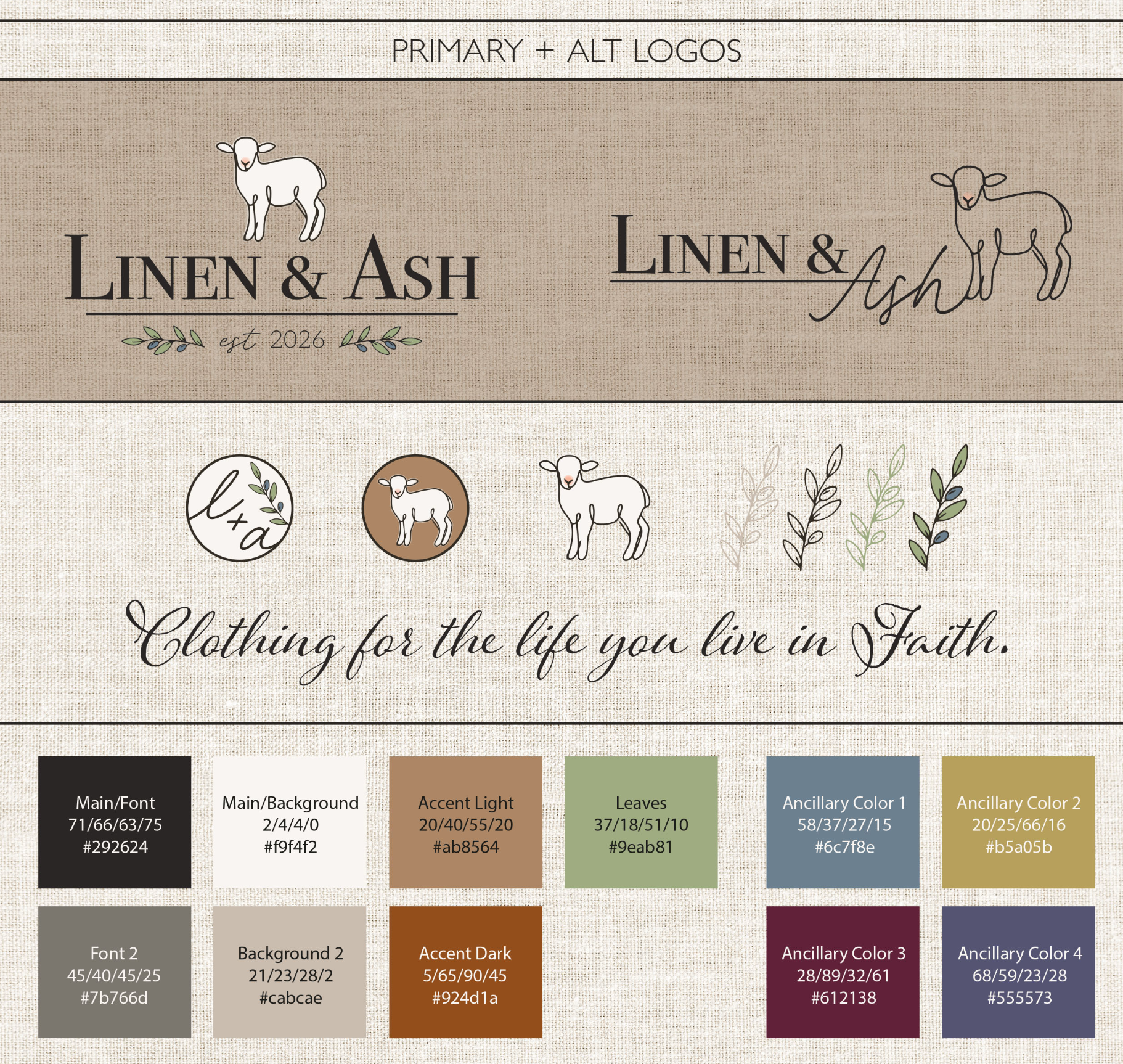 The final deliverables included a primary and alternative logo in both dark and light options, a color palette inspired by both Scripture and nature, reverent typography, and supporting brand assets designed for both print and digital use.